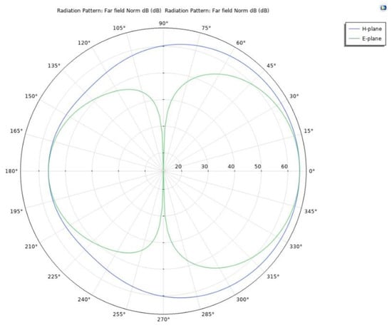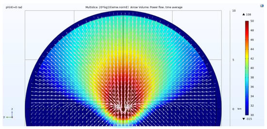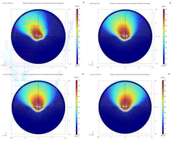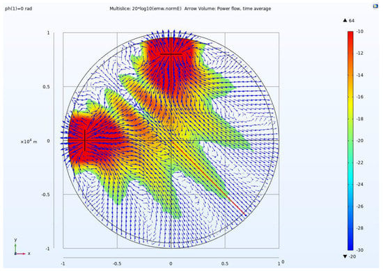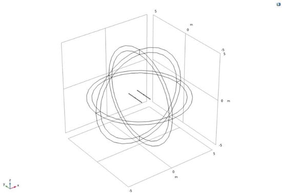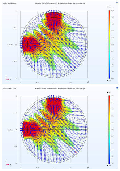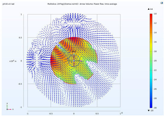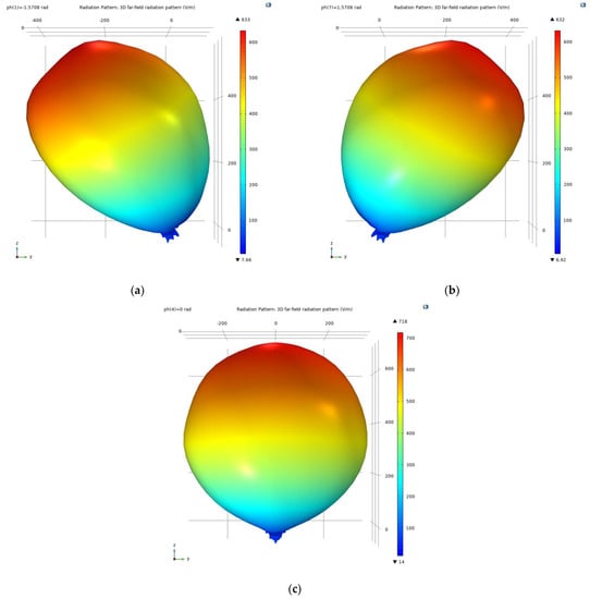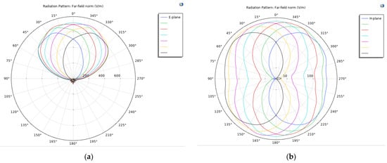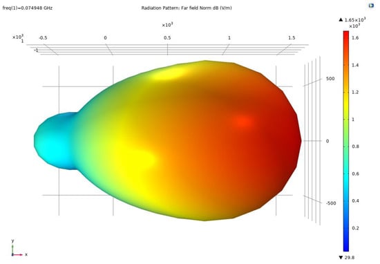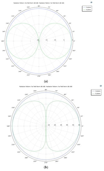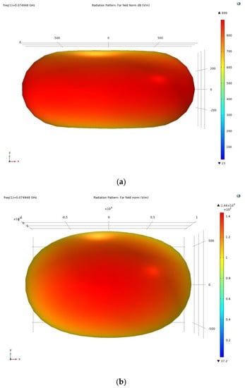 As shown in Figure 2, the space of the model is the air domain with , and , and the free space wavelength at the SD’s operating frequency is 4 m. Thus, the SD arms are 1 m long and are aligned with the y-axis. The arm radius is chosen to be 0.05 m. The 1 × 2 SD arrays are excited with AC voltage signals of the same frequency, amplitude, and phase, which are placed in the air in parallel with an interval of 1 m. Figure 3b shows that the polar plot of the Ff pattern in the xz-plane is isotropic.