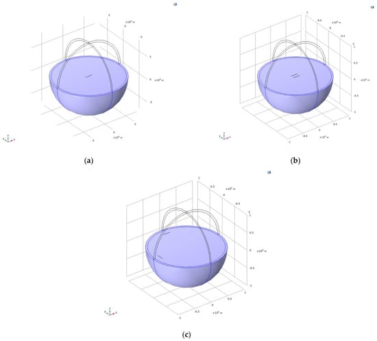 Figure 7 shows the traditional 1 × 1 CSAMT, 1 × 2 GSD array CSAMT, and GSD array tensor measurement CSAMT models, which are sphere models with a radius of 10 km. The upper half-space of the models is the air domain, of which the parameter settings are consistent with those in Figure 2. The lower half-space of the models is the soil domain with , , and . In Figure 7a, a 1 × 1 GSD model with a 2 km length, a 0.04 m radius, and a 0.1 m gap between the two conductors is depicted. Figure 7b shows a 1 × 2 GSD array with two GSDs separated by 1 km placed along the y-axis on the ground, and other parameters are the same as those in Figure 7a. The GSD array tensor measurement CSAMT model is shown in Figure 7c, whose half-space and GSD parameters are consistent with the settings in Figure 7a. The two GSDs of the tensor measurement CSAMT are placed on the two corners of an isosceles triangle with an edge of 8 km, which can ensure that the measurement point is located in the Ff.