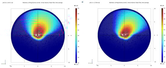 Figure 9 illustrates the 1 × 2 GSD array placed along the y-axis, exciting the same amplitude (800 V) but different phases. For a special example, when the ph of GSD1 is 0 deg and that of GSD2 is −90 deg, the beam is deflected towards GSD2 because the ph of GSD2 lags behind that of GSD1. On the contrary, when the ph of GSD2 is ahead of that of GSD1, the beam will steer towards GSD1.