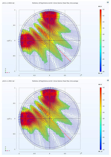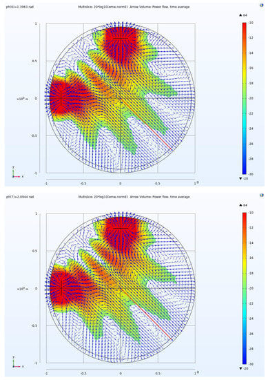 Amplitude of the E-plane EFc and Poynting vector direction when asymmetry occurs. The 1 × 2 GSD arrays were given excitations with the same voltage (800 V) but different phases; the ph of GSD1 is 0 deg and that of GSD2 changes from −90 to 90 deg, varying every 30 deg.