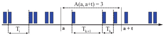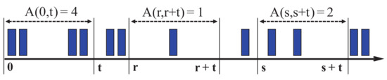 In general, we assume that the flow representing IP traffic is random, with representing a stochastic process and corresponding random variables. Another simplification is that we take into account only the so-called stationary random processes. Simply put, all probabilistic characteristics of a stationary process are invariant with respect to time. It does not matter in which time interval we started to observe the flow, it only depends on the length of the observation, as shown in Figure 2.