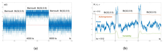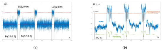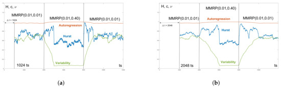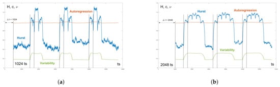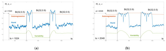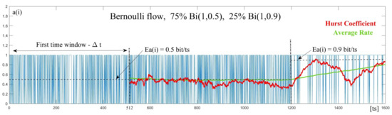 In Scenario 1.1, we simulated the first third of the record, which represented standard network operation, using a Bernoulli process with increments with . The Bernoulli process is suitable as a flow model for the core network or in the case of aggregating a large number of independent flows. The second third represented a DDoS attack, which we simulated as a Bernoulli process with increments . The mean rate of flow thus increased to , while the variance of the process was significantly reduced. The last third consisted of the first Bernoulli process. We were interested in the reaction of the coefficients not only to the onset of a DDoS attack, but also to the return to normal operation. In order to optimize the Hurst coefficient, we chose the size of the time window equal to a power of two, . On the basis of the performed experiments, we found that the Hurst reacted significantly when the values of the time window were at least , as shown in Figure 6. We gradually implemented experiments with time window and , as seen in Figure 7.