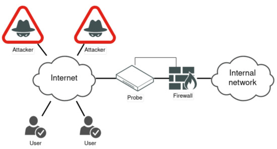 System process flow: Using the online live traffic flow, the self-learning adaptive system calibrates the admissible values of the statistical parameters, describing the normal operation (it learns what the traffic looks like). From these values, it creates a prediction tunnel with which it can detect a DDoS in time. An example of the network topology where the probe is a self-learning system method is shown in Figure 4: