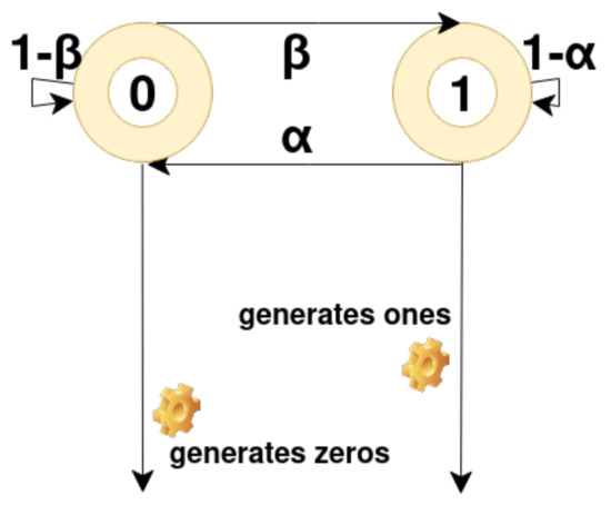 To simulate different scenarios, we chose a two-state Markov modulated regular process (MMRP) [47]. This Markov process chain with discrete time consists of two states between which it randomly switches in each time slot. The probabilities of switching between states are denoted as and . In the first state, the process generates data deterministically (regular flow of one sequences), in the second state it generates zeros. We also refer to such a process as an on/off source of IP traffic. The probability distribution of the states of the chain, which stabilizes over time, is denoted as and we call it the stationary distribution. An analysis of the MMRP can be found in [48]. Transition graph of Markov chain has form as shown in Figure 5.