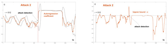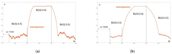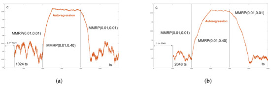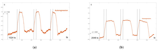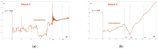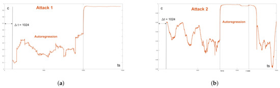 The autoregression coefficient c had a significantly smaller dispersion of values than the Hurst coefficient, therefore, the reaction to the change in flow was not visible at all on the common figures together with the other coefficients. Therefore, for the time windows and , we show AR(1) in a separate Figure 8. The reaction to the onset of attack traffic is evident.