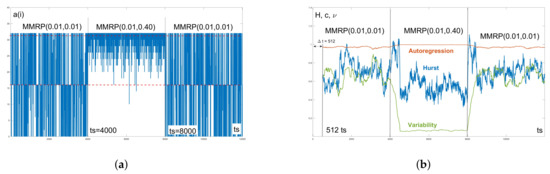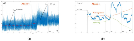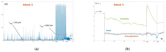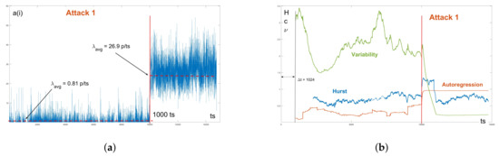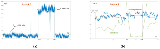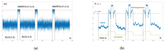 Figure 3 shows a simulation for a Bernoulli flow of bits with a length of 1600 time slots (ts). In the first three quarters of the flow, the increments have a binomial distribution and the mean of the increments is . In the last quarter, the increments have distribution and the mean of the increments is . For this flow, we gradually calculated the values of the average rate and Hurst coefficient. We deal with this in more detail in the next section. We first estimated the parameter values from increments in a time window of 512 ts, then we moved the time window by one time slot and recalculated the parameter values. In the picture, we can see that when loading, for example, 10% attack traffic (ts = 1251), the value of the average rate changed from 0.5 to almost 0.6, while the value of the Hurst coefficient changed significantly from 0.4 to 0.9. We can see that the Hurst parameter reacted significantly faster to a DDoS attack than the average rate of the flow.