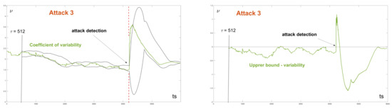 The coefficient of variation expresses the degree of variability of the observed random event [46]. In the case of a standard DDoS attack, we expect a significant increase in the average rate of the number of packets in a given time window, but at the same time a decrease in the dispersion of the network flow of packets generated by the attacker. Under these assumptions, the coefficient of variation could serve as a significant identifier of a DDoS attack.