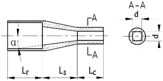 This paper selects the nozzle length-to-diameter ratio and contraction angle as the main parameters researched. The length-to-diameter ratio lc/d is the outlet length to the diameter of the inscribed circle of the outlet square hole; the contraction angle α is the angle between the generatrix of the circumscribed cone of the constriction section channel and the axis.