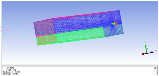 Numerical analysis was conducted using the simulation software FLUENT. To simulate the inner and outer flow fields, we used thick and dense grid nodes to represent the inner part and connected it to a large area representing the external flow field using thin and sparse grid lines. Since the jet flow structure is a symmetrical structure along the axial direction, the model of the jet flow structure was built for half of the model along the axial direction, as shown in Figure 3. The mesh consisted of 343,356 elements and 327,850 nodes. Referring to the boundary conditions, the gravitational acceleration was set to 9.81 m/s2, and the outer part was designed as a cuboid with a width and height of 0.2 m and a length of 1 m to ensure that the water jet could fully move in the flow field. The average flow rate at the initial position of the inlet was set to 15, the wall was set as an adiabatic wall, and the medium in the flow field was set as water (continuous fluid with low viscosity). It was assumed that the nozzle surface was insulating, that no heat conduction occurred in the nozzle, and that water was the medium in the flow field.