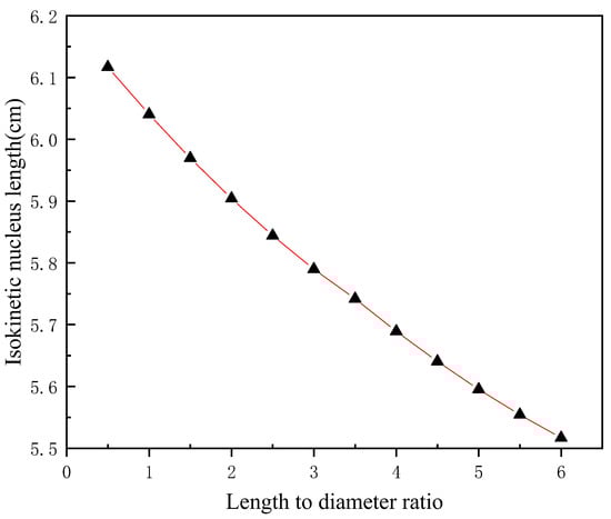 Figure 5 concisely records that the nozzle with a larger length-to-diameter ratio had a shorter jet isokinetic nucleus length. The physical explanation is that a more extended outlet section causes the flow to lose more energy along the way, the jet velocity with a larger length-to-diameter ratio nozzle decreases more quickly, and the constant-velocity core is shorter.