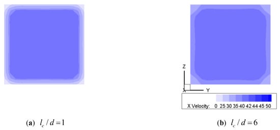 Images of flow velocity at the outlet with length-to-diameter ratios of 1 and 6.
