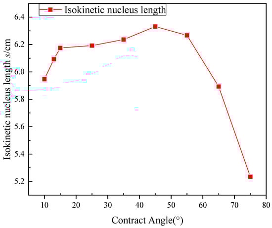 In Figure 8, the relationship between isokinetic nucleus length and contract angle describes that when, , the core length fluctuated within a relatively smaller range; however, when , the length dropped rapidly. The contraction angle was negatively correlated with the length of the contraction section. The fluid flow in the nozzle contraction section and outlet section was turbulent, resulting in its low stability and faster energy dissipation. Therefore, flow with a larger contraction angle enters the basic section earlier, its velocity decreases more quickly, and the constant-velocity core is shorter.
