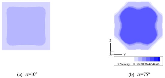 Figure 9a,b show the difference between and . It can be seen in Figure 9 that the nozzle with a contraction angle of 75° had a higher jet center velocity. When the contraction angle was too large, the velocity near the wall decreased. This is because, when the nozzle contraction angle is too large, there is a phenomenon of liquid flow shrinking at the exit of the contraction section. At the exit of the contraction section, a local liquid flow breaks away from the wall and then attaches to the wall. Therefore, when liquid flows close to the wall, speed and energy are lost. Because the jet of a nozzle with an excessively large contraction angle loses more energy in the nozzle, the jet velocity decays more quickly after the liquid flow leaves the nozzle.