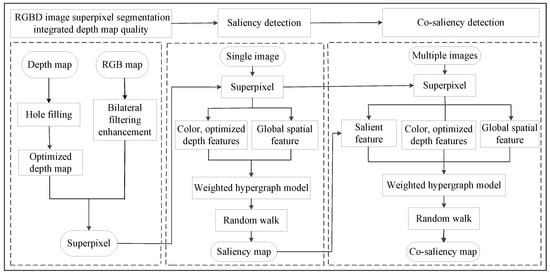 Although the above RGBD co-saliency detection model has achieved certain results, in scenes with complex backgrounds or scenes with similar foreground and background colors, there are problems such as the incomplete extraction of co-saliency regions, and unclear boundaries. Therefore, an improved co-saliency detection algorithm for RGBD images is proposed. Firstly, a fusion depth–quality RGBD image superpixel segmentation is proposed to segment RGBD images into non-overlapping blocks. Secondly, the color features, depth features after optimization and global spatial features of superpixels are extracted to construct a weighted hypergraph model to generate saliency maps. Finally, a novel weighted hypergraph model is constructed according to the color feature, optimized depth feature, global spatial feature and saliency feature relationship among images to generate a co-saliency map. The main contributions are summarized as follows: