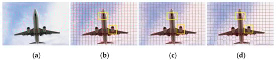 In our study, the number of superpixels is set to 300; we compare the proposed method with two representative methods, which include SLIC [] and SLIC-D []. As in Figure 4, it can be seen from the part of the yellow rectangular frame that the proposed superpixel segmentation method not only suppresses irrelevant edges inside the object, but also improves the object edge fit.