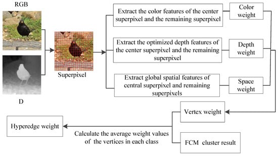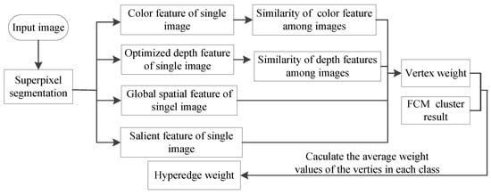 Firstly, the RGBD image is divided into superpixel blocks. Secondly, we use the FCM clustering algorithm to construct a general hypergraph model. The number of categories of the clustering results is taken as the edges of the hypergraph, and the number of superpixels in each category is taken as the vertices of the hypergraph. Finally, the global spatial feature similarity, color feature similarity and optimized depth feature similarity are used to construct the weighted hypergraph model. The vertex and hyperedge weighting process in saliency detection method is shown in Figure 5.