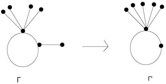 For , then is obtained from the graph by removing leaves from the vertex whose degree is and connect these vertices to the end vertex whose degree is ; for more details of this transformation, see Figure 1.