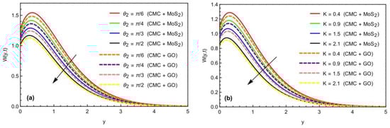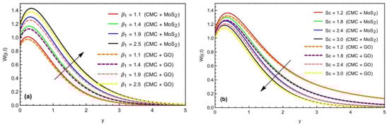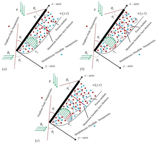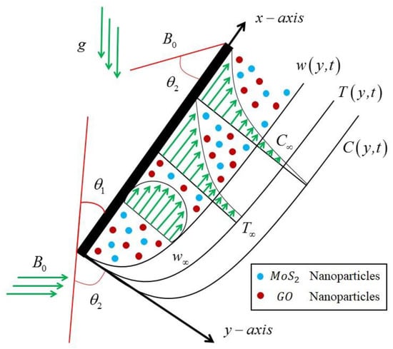 We investigate an unsteady, incompressible, free-convective MHD (magnetohydrodynamics) Casson nanofluid flow over an inclined plate as shown in Figure 1, which characterizes an asymmetrical behavior of the fluid flow and heat transfer with significant impacts of slip boundary conditions. The plate originated in the xy-plane with an inclination angle of . The Newtonian heating effect, slip boundary, and porosity are also supposed in the respective boundary conditions and governed equations. Initially, at , the plate and mixed suspension of two nanoparticles (MoS2 and GO) with CMC-based fluid form a distinct nanofluid. The thermophysical properties of these nanofluids are in thermal equilibrium. Moreover, the temperature and concentration are both constant with and , respectively. After some time , the inclined pored plate starts to oscillate with velocity . Due to vibrations and a temperature rise, the stationary fluid begins to flow on the pored oscillating plate with the same velocity as the vibrating plate. Moreover, it is assumed that the temperature, concentration and velocity are dependent over y and t. The mathematical representation of Casson fluid is defined in the following equation [57].