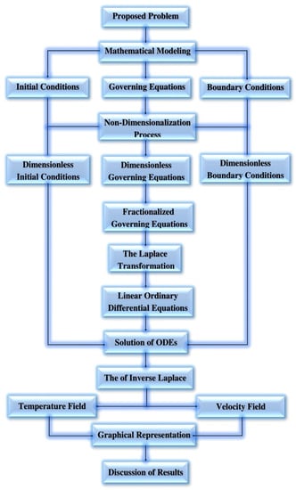 Casson fluid fractional model with free-convective NF-containing molybdenum disulfide (MoS2) plus base fluid and graphene-oxide (GO) as nanoparticles with the suspension of Carboxy-Methyl Cellulose (CMC) as base fluid with porosity, inclined magnetic field, Newtonian heating on temperature, and slip boundary condition on velocity are studied in this article. These nanoparticles have unique thermo-physical properties, as shown in Table 1. The use of the most current definition of fractional derivative, namely, the Prabhakar fractional derivative, distinguishes this study. The dimensionless defined fractional model issue for velocity, temperature, and concentration profiles is addressed using the LT approach, and Stehfest’s and Tzou’s methods are used for Laplace inversion. For detailed knowledge of the extensive importance of the considered flow problem, graphs are depicted including physical parameters as and φ. In addition, a flowchart (see Figure 2) has been included in the report to help illustrate the entire situation of the research effort. In addition, graphical demonstrations for temperature field, concentration, and velocity are provided in Figure 3, Figure 4, Figure 5, Figure 6, Figure 7, Figure 8, Figure 9, Figure 10, Figure 11, Figure 12 and Figure 13 by changing the values of , and other essential system parameters.