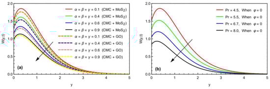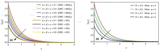 Impact of (a) and (b) on thermal profile when is fixed for both graphs and values, respectively.