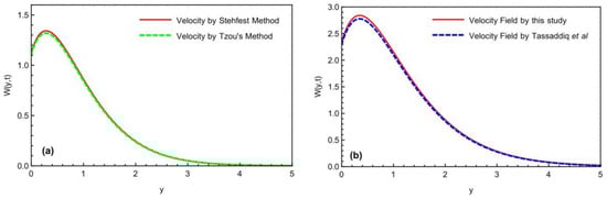 Comparison of velocity profile (a) with previously published works for the limiting cases (b) [32].