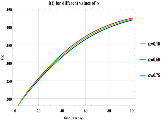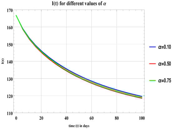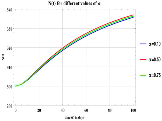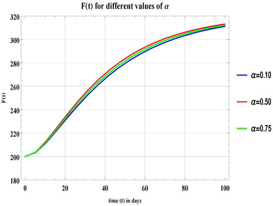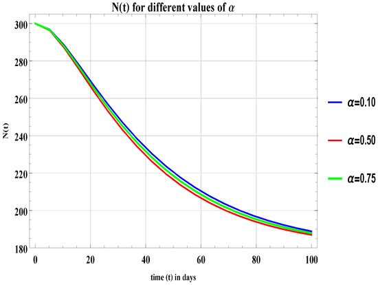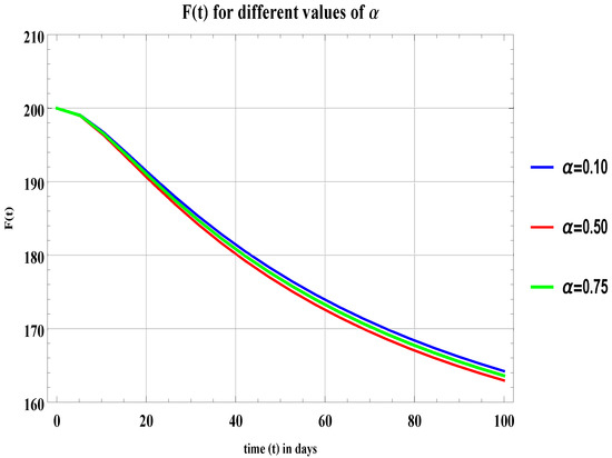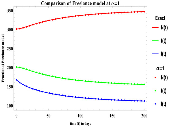 where , h is the stepsize calculated as in the classical Euler’s method. For solving this model numerically, we consider the same parameters and initial values as given in [9]. According to [28], the parameters have value , , , , , and . Now, the fractional freelance model in Equation (9) with the iterative formula, Equation (20) becomes