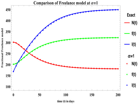 Results obtained graphically describes the impact of information on population about freelance. As in Figure 1, the comparison of fractional freelance model at is given with the numerical solution of this model in [9] by keeping the parameters and initial values same in both papers. If we consider , then it means that the negative information is prevailing among communities about freelancing and therefore we can observe the decline in and . If people hear about bad experiences related to freelancing then they would not like to take risks with their stable income and therefore would not also suggest someone engage in freelancing. Hence, the population on will increase.