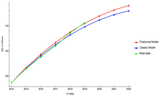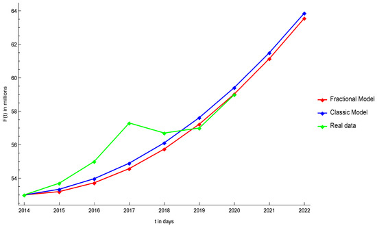 To verify the importance of this model in the real world as compared to the classical freelance model, we consider the real life data of US employees that are freelancers or non-freelancers. Table 5 describes the data taken from [29,30] of freelancers and employees that are non-freelancers in the US; therefore, the parameter selection also varies according to the real data—parameters have value , , , , , and . In addition, for this solution, we consider, . All calculations are performed in the millions. Figure 9 shows the pattern of employees from 2014 to 2020 and shows that the fractional model is predicting it more accurately than the classic model of freelance. Figure 10 shows the pattern of freelancers from 2014 to 2020 and shows that the fractional model is predicting it more accurately than the classic model of freelance.