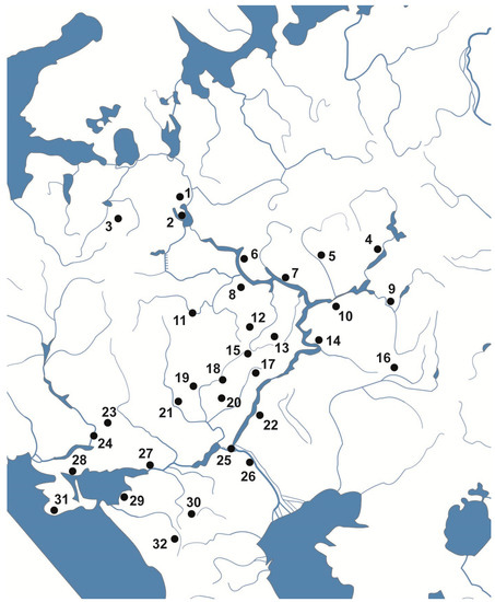 Sample sites of the sand lizard in the European part of the species range (samples 1–32 are located from the north to the south, from the Vologda region to the Krasnodar region).
