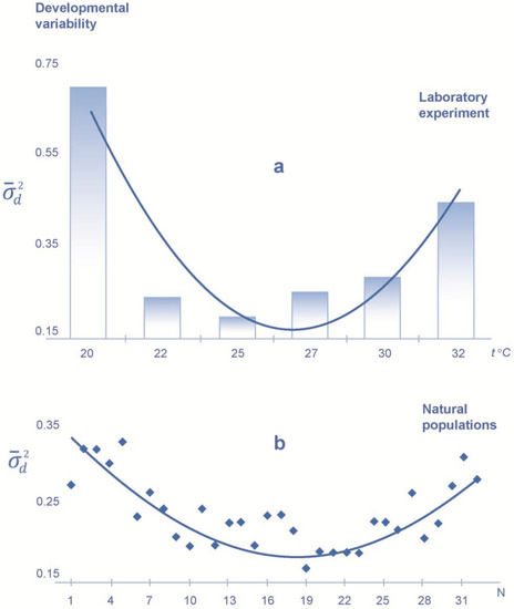 In this study, the similarity of the experimental and population data on the dependence of the level of developmental variability on temperature is manifested not only in the general trend, but also in a specific reaction for different temperature impacts. A stronger reaction of the index value on the temperature decrease than on the temperature increase from the optimal regime of about 25 °C in the laboratory experiment corresponds to the higher index values in the samples from the populations in the northern periphery of the range than in the southern one. All this demonstrates the crucial role of the temperature impact for the phenotypic variation under study.