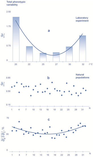In the laboratory experiment, the minimal level of both kinds of variability, including total phenotypic variability () and developmental variability (), corresponds to the temperature (25 °C), which can be characterized as optimal, increasing both with an increase and with a decrease in the temperature from this regime (Figure 2 and Figure 3). The variance value is significantly higher at extreme temperature conditions than at 25 °C (p < 0.01 for the F-statistic). An increase in the value of variability is more pronounced with a decrease than with an increase in temperature from 25 °C.