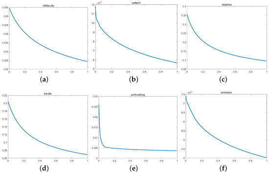 Plots of the UB() in six real datasets: x axis: and y axis: UB(). (a) UB for different values of on UKfaculty; (b) UB for different values of on caltech; (c) UB for different values of on dolphins; (d) UB for different values of on karate; (e) UB for different values of on politicalblog; (f) UB for different values of on simmons.
