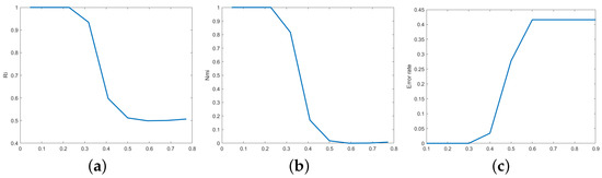 Ri, Nmi, and Error rate for different mixing parameters: x axis: and y axis: Ri, Nmi, Error rate. (a) Ri for different values of ; (b) Nmi for different values of ; (c) Error rate for different values of .