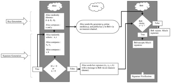 Alice randomly chooses the prime p and she chooses another element such that . Then, the public parameter is the pair . The three main parts of the digital signature are key generation, signature generation and signature verification, which are as follows.