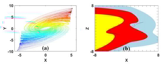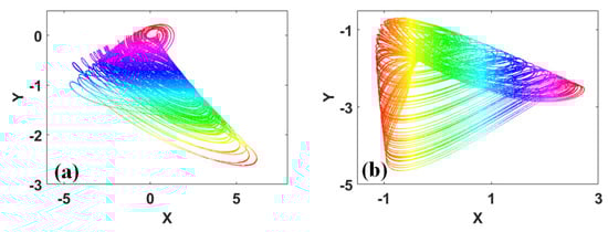 Typical asymmetrical attractors: (a) x-y plane, when a = 6 and b = 1 under IC = (1, 1, 0) in System (13), (b) x-y plane, when a = 0.9 and b = 1 under IC = (0.8, −2, 0) in System (14).