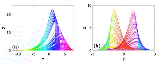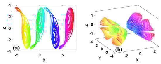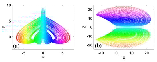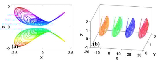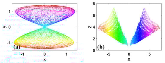 The aesthetic value of coexisting hidden attractors [,,] can also be found. Some chaotic attractors look like two symmetrical fans. The typical coexisting fan-like attractors are plotted in Figure 7.