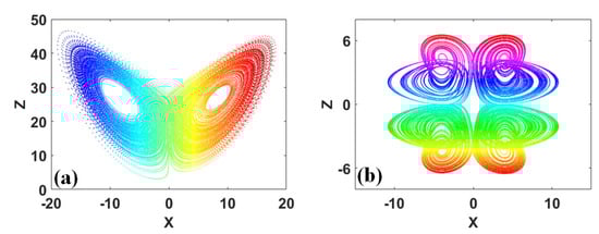Typical butterfly-like attractors: (a) x−z plane, when a = 10, b = 8/3, and c = 28, IC = (1, 1, 1) in System (5), (b) x−z plane, when a = 0.6, b = 1, c = 1, d = 4, and e = 2, IC = (1, 1, 1) in System (6).