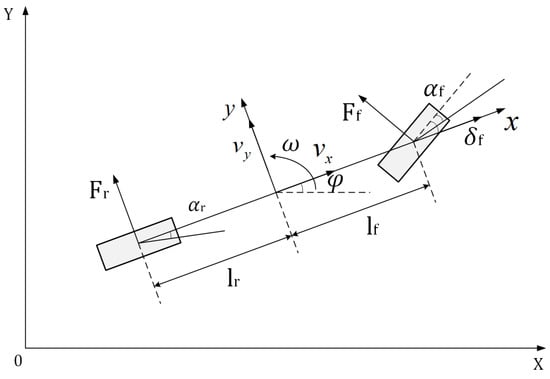 The T-FVDM describes the vehicle dynamic system with some simplifications and assumptions, which simplifies the analysis process and retains the most basic vehicle dynamics. Therefore, it has a wide range of applications in vehicle dynamic research and vehicle control. Although the T-FVDM is simple, it quantifies the key parameters affecting the lateral motion of the vehicle, including the position of the vehicle’s center of mass and the lateral deflection characteristics of the tires. Clearly, these are the basis for studying the manipulating stability of vehicles []. In this paper, according to the principles of vehicle dynamics, a T-FVDM is established, which takes into account two freedoms of vehicles, i.e., lateral and yaw.