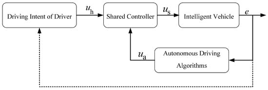 The above description illustrates that there are still many issues to be resolved to achieve a breakthrough in high-level autonomous driving technique without human involvement. As is known to all, it is not only limited by the technological development, but also by the constraints of relevant legal imperfections. At present, most autonomous vehicles still need the participation of drivers, which provides guidance and assess the potential hazards in the presence of the failed algorithm. The human–machine cooperative control uses the asymmetric advantages of human intelligence and machine intelligence, for achieving the hybrid enhancement of human–machine intelligence and the two-way information exchange. Therefore, the active safety assisted control or shared control technology with human involvement is expected to reduce traffic accidents []. Notely, the human–machine shared control method has been widely used in auxiliary robots [,], remote operation robots [,] and intelligent vehicles [], which balances the advantages of driver and automatic vehicles to achieve the best cooperation [,,]. Shared control provides a solution to the problem for driving controller conversion of intelligent vehicles [].