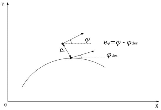 LQR optimal control has the ability to achieve the desired performance index with low cost, and to tune the unstable system simultaneously [,,]. When the intelligent vehicle tracks the target path, the distance and heading deviations need to be considered. To be clearer, they are described in Figure 3. The distance deviation is the distance from the centroid of the vehicle to the road centerline, and the heading deviation is the deviation between the vehicle heading and the road direction; is the ideal heading angle.