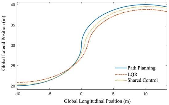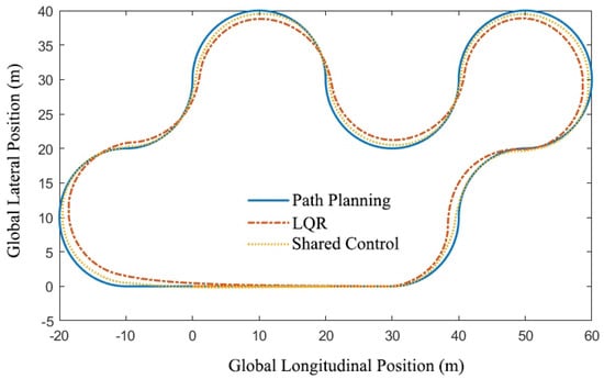 The simulation results are shown in Figure 5 and Figure 6. It can be seen that the LQR and shared controllers can track the planned path well, as shown in in Figure 5. For a comparison, the distance deviations of LQR and shared controllers are given in Figure 6, The tracking performance of the lateral controller based on shared control is better than that of the LQR-based autonomous driving controller. To quantify the results of the LQR control and the shared control, we introduce and , which are the trajectory tracking errors of the LQR control in terms of x and y directions, respectively. Accordingly, and are the trajectory tracking errors of the share control in terms of x and y directions, respectively. For comparison, the performance index is calculated for the LQR control and shared control cases, respectively, i.e., and . Clearly, the superiority of the proposed shared control method is verified.