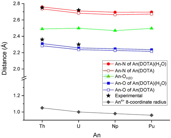 Comparison of computed and experimental [] An–O and An–N bond distances of the AnIV(DOTA) complexes, as well as the An4+ 8-coordinate effective ionic radii []. The slightly different computed values originating from the C2 symmetry of An(DOTA)(H2O) structures are averaged. The presented values are given in Table S1 of the Supplementary Materials.