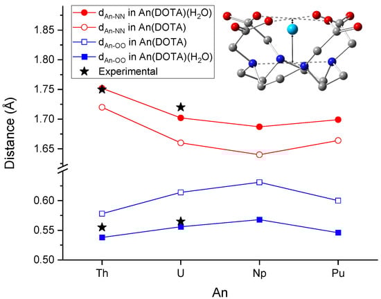 Comparison of computed and experimental [] distances of An to the planes of the O and N donors (defined by the midpoints of the O⋯O and N⋯N lines, see insert) in the complexes. The different values originating from the C2 symmetry of An(DOTA)(H2O) structures are averaged. The presented values are given in Table S2 of the Supplementary Materials.