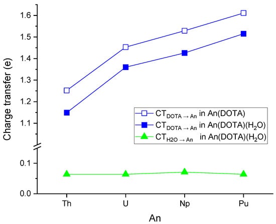 The above discussed An charges are determined by the charge transfer (CT) from the ligands to the An4+ ions during complex formation. From the two ligands in the An(DOTA)(H2O) complexes, the dominant CT occurs from DOTA due to the anionic character and multiple number (8) of the donor atoms. However, the CT is somewhat less in the An(DOTA)(H2O) complexes as compared to An(DOTA) because of the larger donor-An distances (cf. Figure 2). Another characteristic feature is the gradual increase in the transferred charge from Th to Pu, implying a simultaneous increase in covalent bonding. The slope becomes slightly steeper between Np and Pu with respect to that between U and Np. This may be associated with the observed out-of-trend move of Pu towards the O donors in Figure 3. In contrast, the CT from the neutral H2O ligand is marginal and nearly constant along the An row (cf. Figure 4).