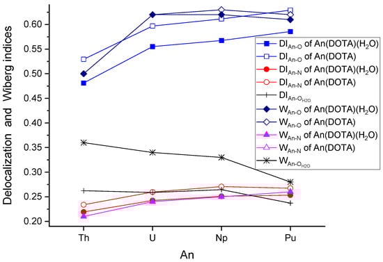 Another important integral property from the QTAIM analysis is the delocalisation index (DI), which corresponds to the number of shared electrons between An and the donor atoms of the ligands. The DI values depicted in Figure 5 confirm the dominance of the An–ODOTA interactions in the covalent bonding. These DI values suggest an An–ODOTA covalent bond order of ca. 0.5–0.6, in good agreement with the Wiberg bond indices [] (cf. Figure 5). The increasing trend from Th to Pu agrees qualitatively with that of the CT shown in Figure 4, as well as with literature examples on related AnIV complexes [,,].