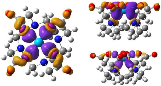 The natural orbital of chemical valence (NOCV) analysis [] provides further details on the metal–ligand interactions in the complexes. Figure 6 shows NOCV orbital pairs representing the most significant DOTA → An donations in Th(DOTA). Relevant Kohn–Sham orbitals are depicted in Figure S1 in the Supplementary Materials. Whereas the NOCV picture demonstrates the charge accumulation and depletion in the bonding space and DOTA, respectively, in terms of Kohn–Sham orbitals, the metal–ligand interactions are extensively mixed with other intra-DOTA orbital interactions. In all the shown metal–ligand interactions, Th participates with hybrid 6d/5f atomic orbitals, in most cases with 6d major contributions.