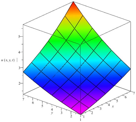 In the present study, the IDS was developed on the basis of a new approximation for RLFD operator that was derived in Lemma 1 for 2D VO-TFMSDE. The numerical results were compared with the exact solution and with the results in []. Chen [] numerically solved the VO-TFMSDE and treated the VO fractional derivative by Grünwald-Letnikov. In Table 1, the proposed IDS shows better accuracy at various values of space and time steps and derivative of VO , and Table 2 shows the accuracy with the exact solution. For more confirmation, Table 3 shows the even better accuracy of the suggested scheme for two-dimensional RSP-HGSGF with fractional derivatives. Figure 1 and Figure 2 represent the exact and approximate solutions, respectively, at , which were more similar, and the approximated solution converged to the exact solution. Figure 3 and Figure 4 represent the comparison of IDS with the exact solution, which showed high accuracy at and respectively.
