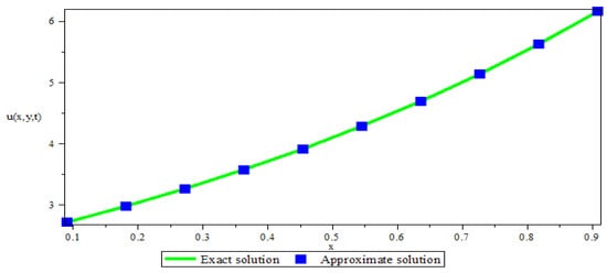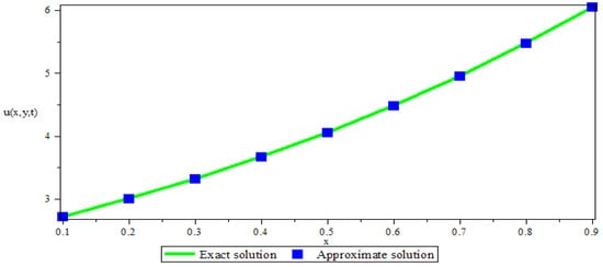 The comparison plot of the exact and approximate solutions of Equation (23) at , , and .