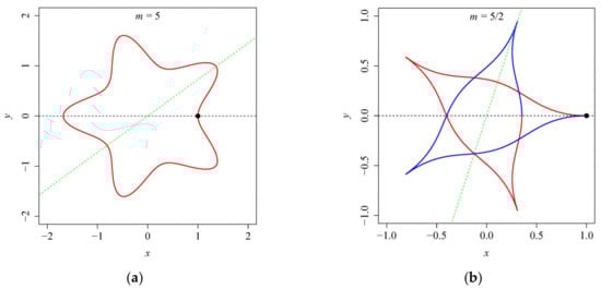 Representative curves generated by Equation (3) with a = 1, n1 = 2, n2 = 5, m = 5 (a) and with a = 1, n1 = 0.5, n2 = 0.5, m = 5/2 (b). (a) Gielis curve (red line) with 5 angles closes after one rotation (0–2π) for m = 5, which is rotationally symmetric with rotation angle 2π/5; the green line is the axis of symmetry y = tan(π/5)x; (b) Gielis curve (red line and blue line represent the curve generated by r(φ) when φ ∈ [0, 2π) and [2π, 4π), respectively) with 5 angles closes after two rotations (0–4π) for m = 5/2, which is rotationally symmetric with rotation angle 4π/5; the green line is the axis of symmetry y = tan(2π/5)x.