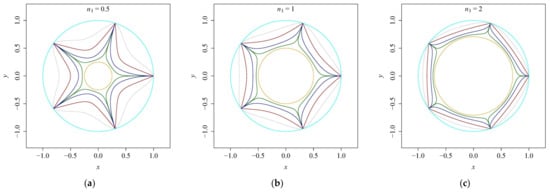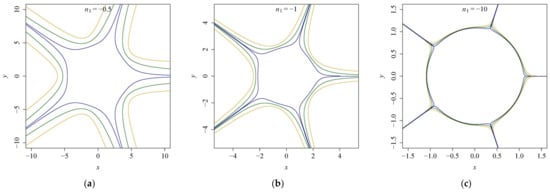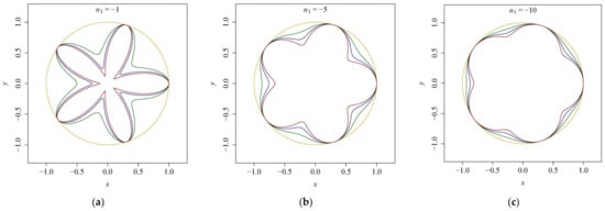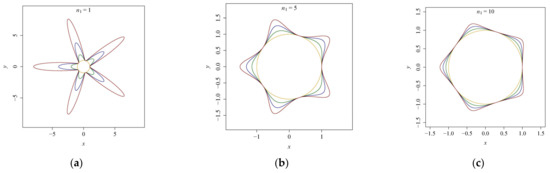 Gielis curves generated by Equation (3) for a = 1, m = 5. The values of n1 are 0.5 (a), 2 (b), 10 (c), respectively, and the values of n2 are −6, −4, −2 from the inside out in each panel.
